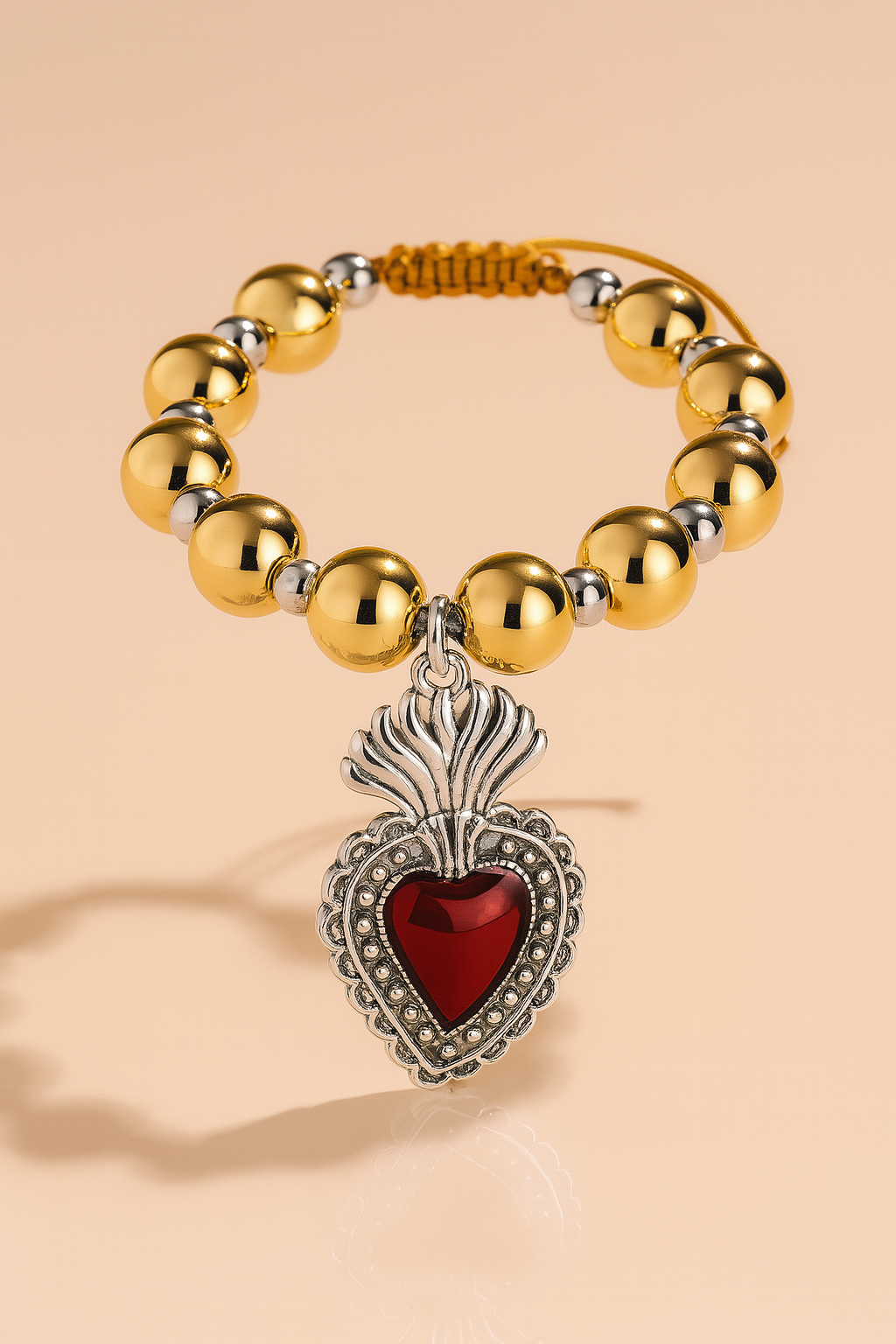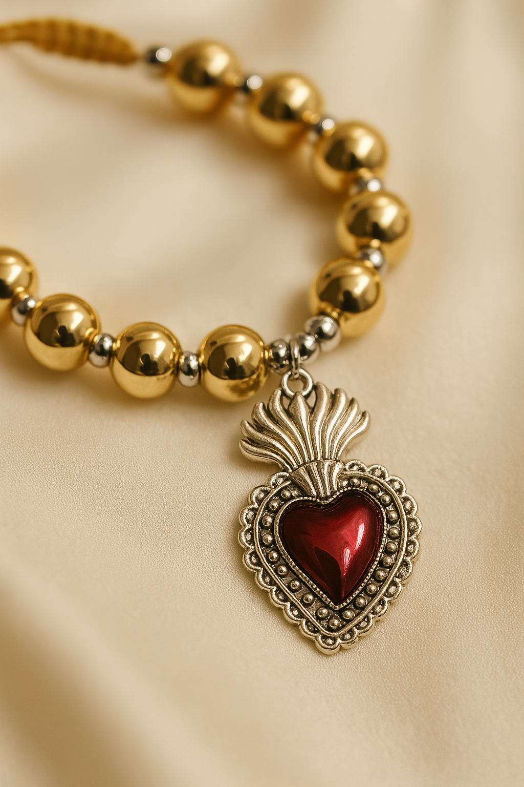 Gold Beaded Bracelet with Red Sacred Heart Charm