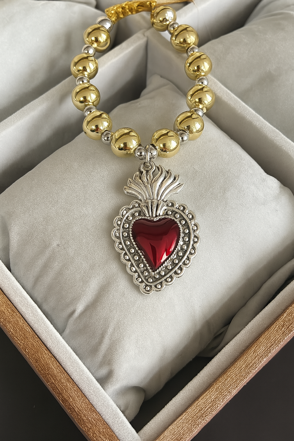 Features a bold red Sacred Heart pendant with vintage silver detailing
