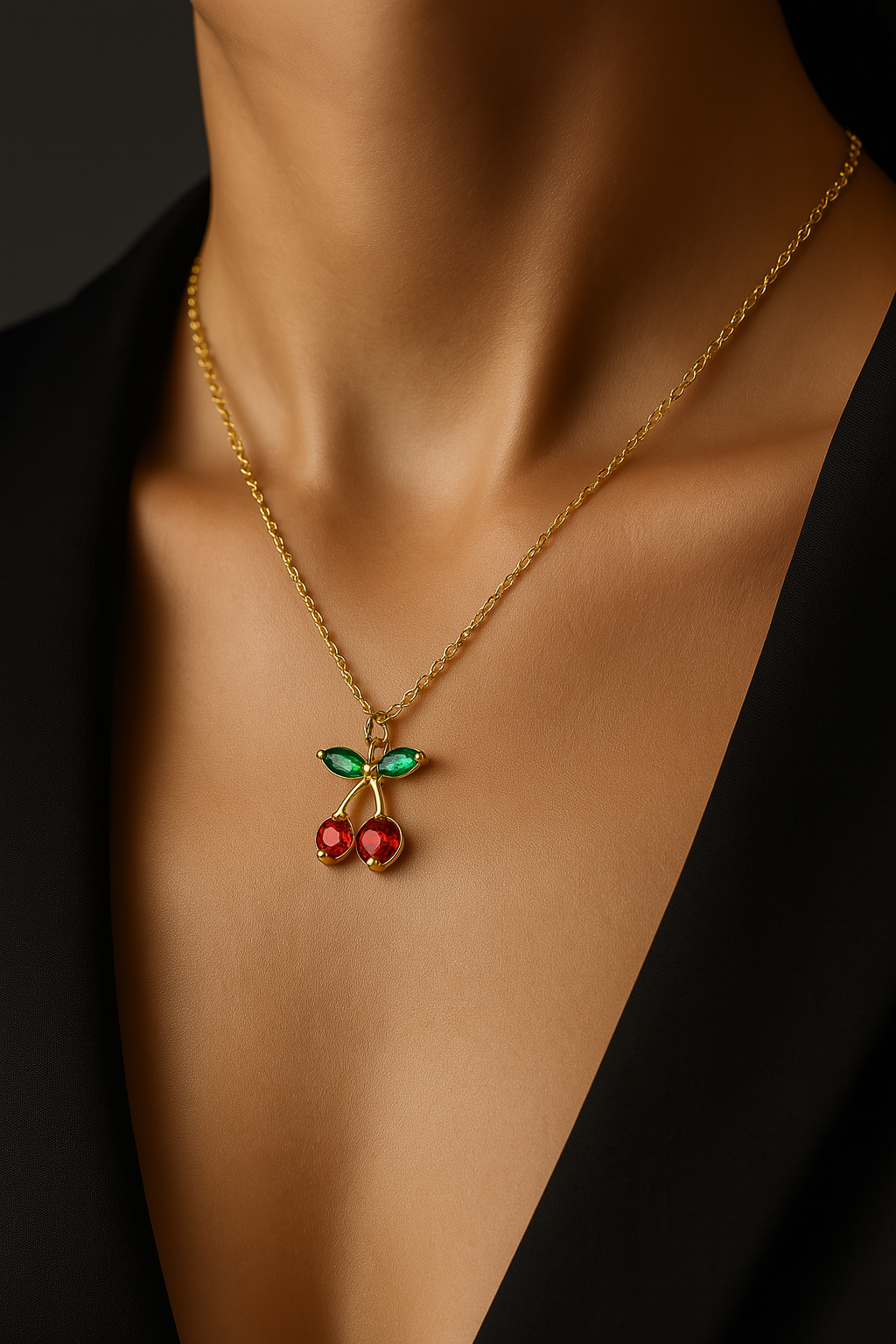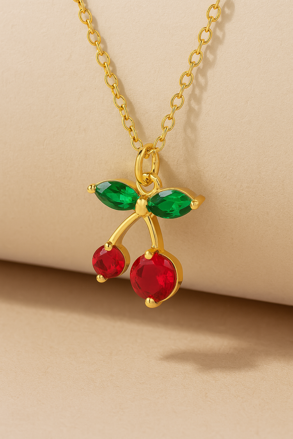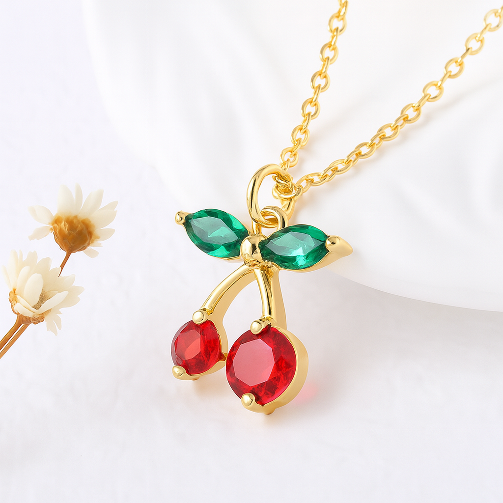 Gold Cherry Necklace with Red & Green Zircon Stones
