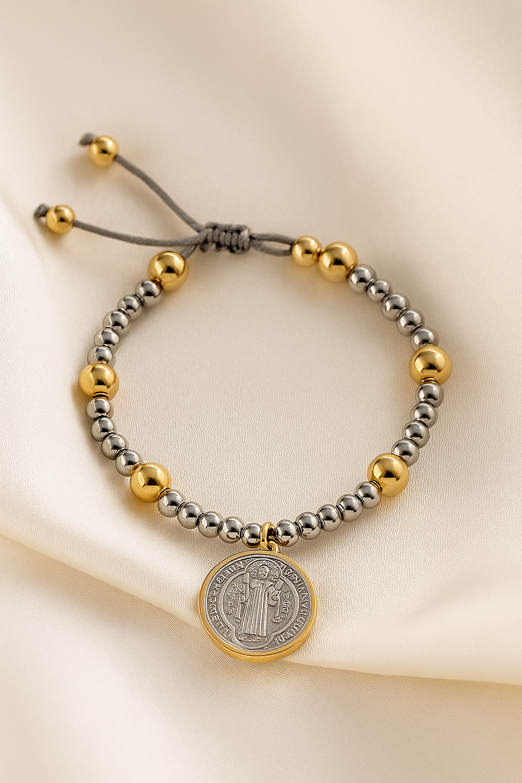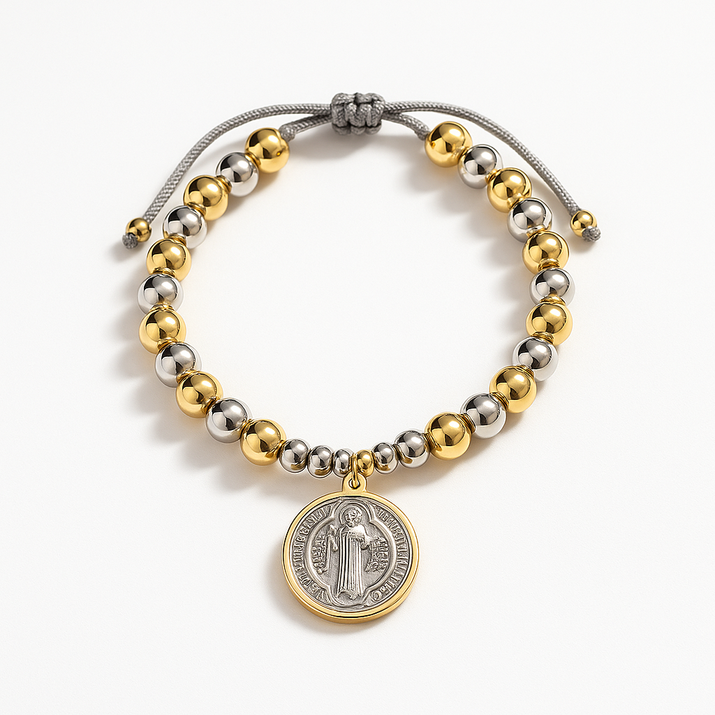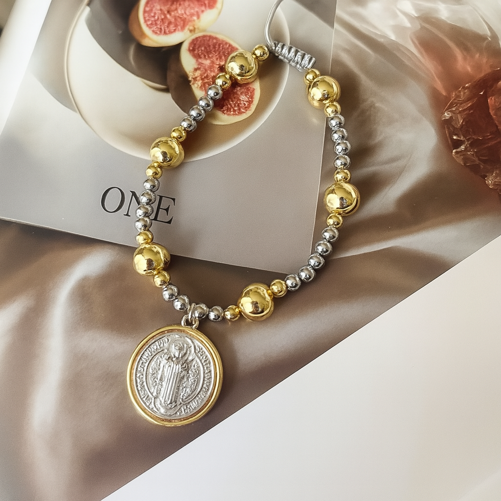 Gold & Silver Beaded Bracelet with Saint Benedict Medal