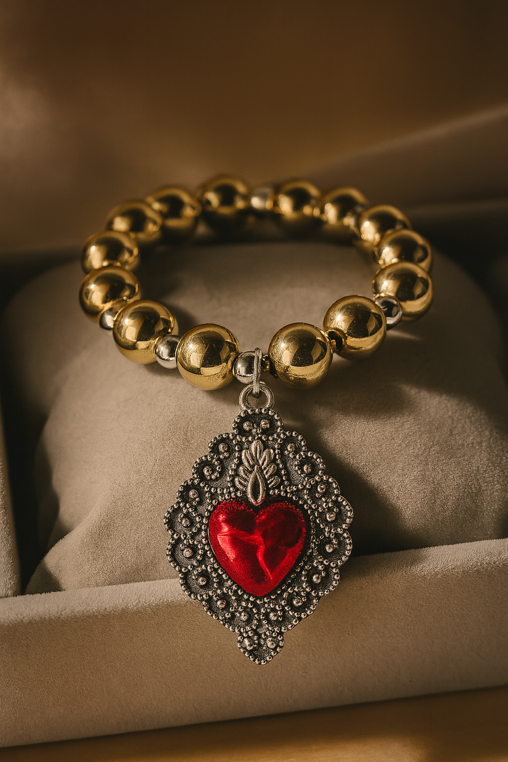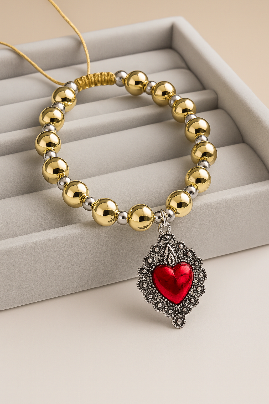 Golden Beaded Bracelet with Enamel Heart Charm
