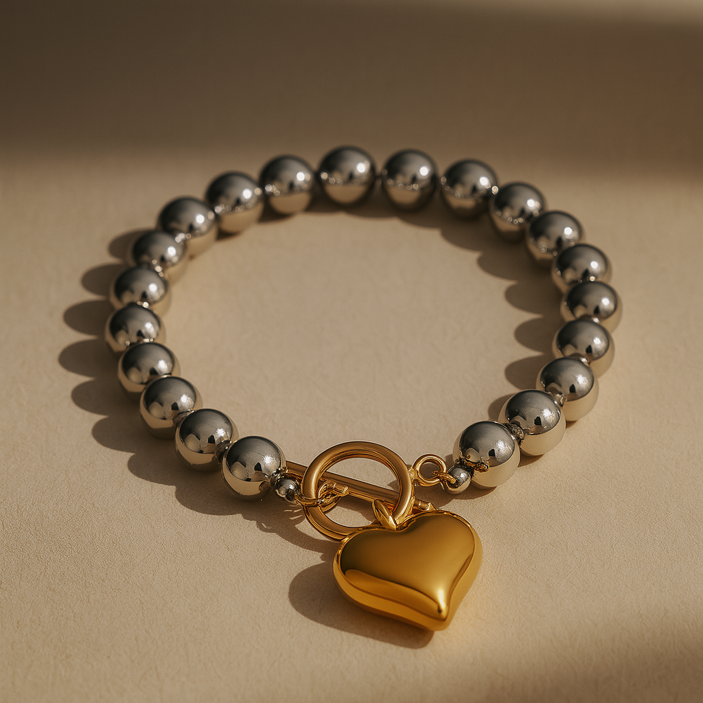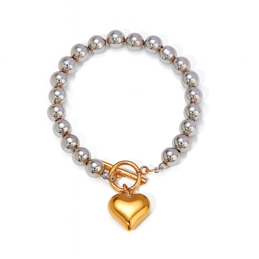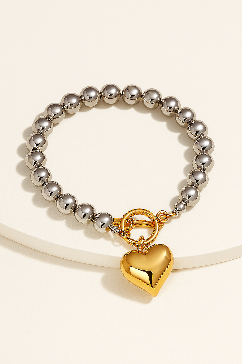 Silver Beaded Bracelet with Gold Heart Charm – Toggle Clasp